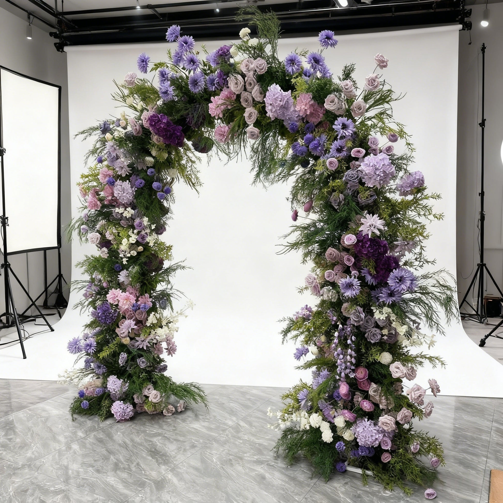 Create a magical and whimsical atmosphere with this stunning purple and lavender floral arch. Featuring a luxurious blend of deep purple, soft lavender, dusty mauve, and ivory artificial flowers including roses, hydrangeas, chrysanthemums, and delicate greenery, this enchanting arch brings a dreamy garden aesthetic to any celebration.