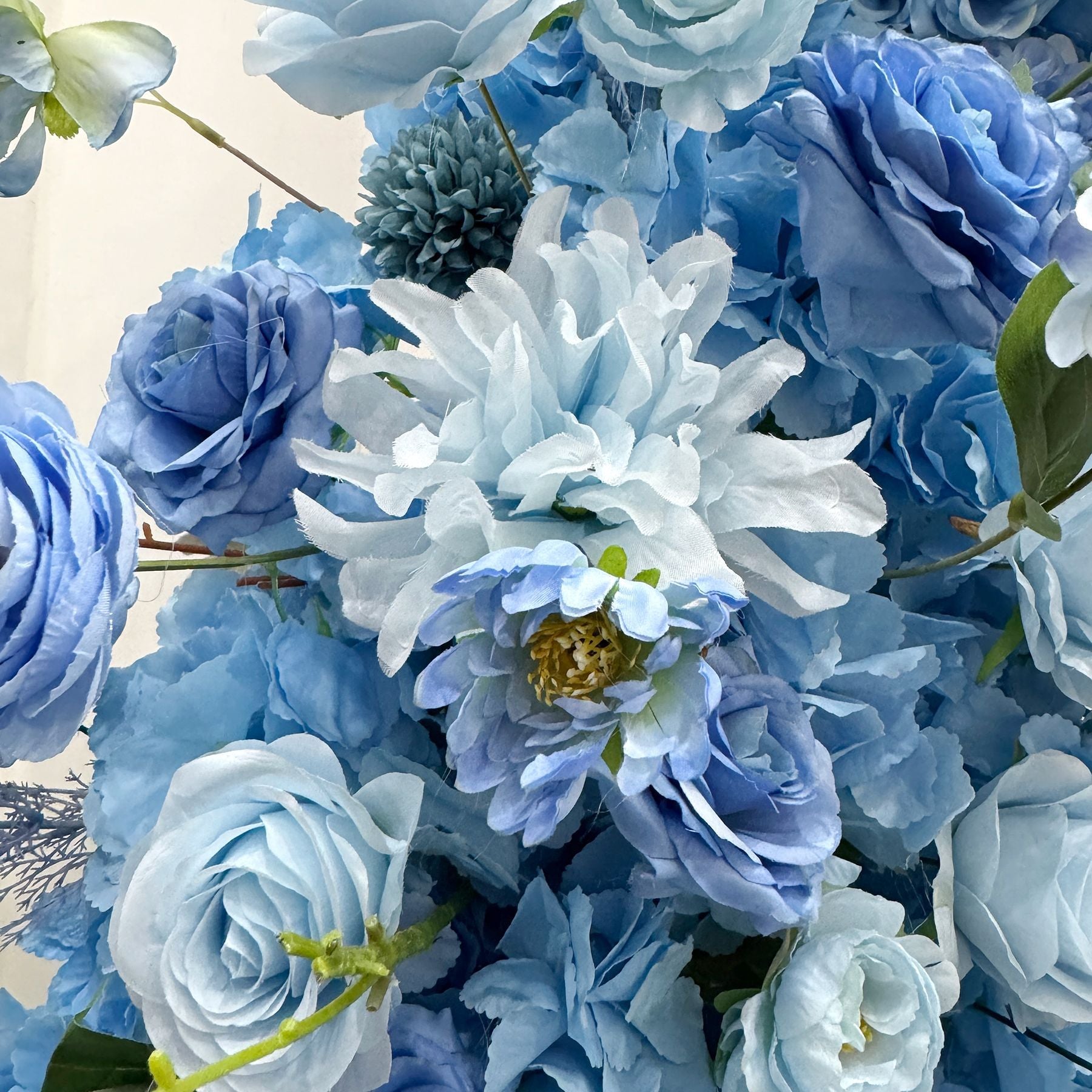 Make a dramatic statement with this breathtaking blue crescent moon floral installation. Featuring an exquisite blend of dusty blue, slate blue, powder blue, and ivory artificial roses with delicate filler flowers, this show-stopping piece creates an ethereal, celestial atmosphere perfect for luxury weddings, upscale events, and Instagram-worthy celebrations.